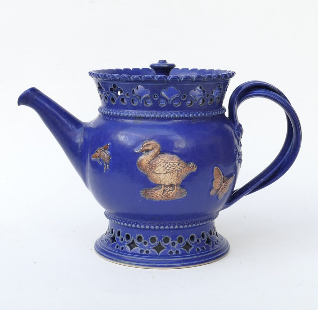 This example has a pierced top and foot rim and decorated with applied “sprigged” motifs of animals. Includes Goose, Bee, Butterfly and Hare.