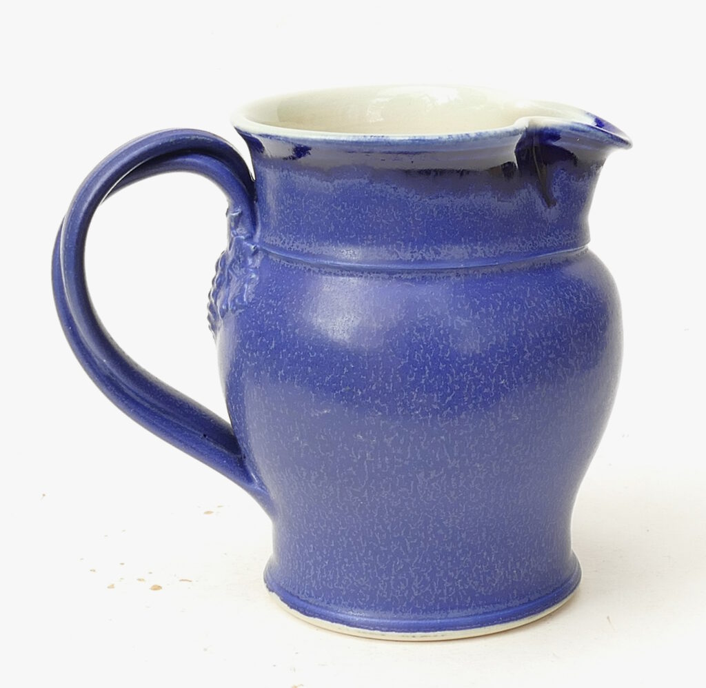 Hand thrown and decorated with a blue glaze over a grape & vine moulding under the handle.