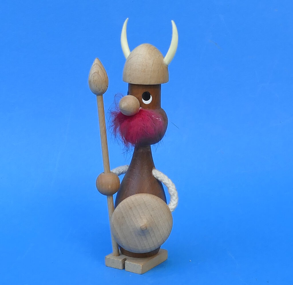 A charming vintage teak and beech wood model of a comic Viking with spear. Red furry beard and painted eyes.