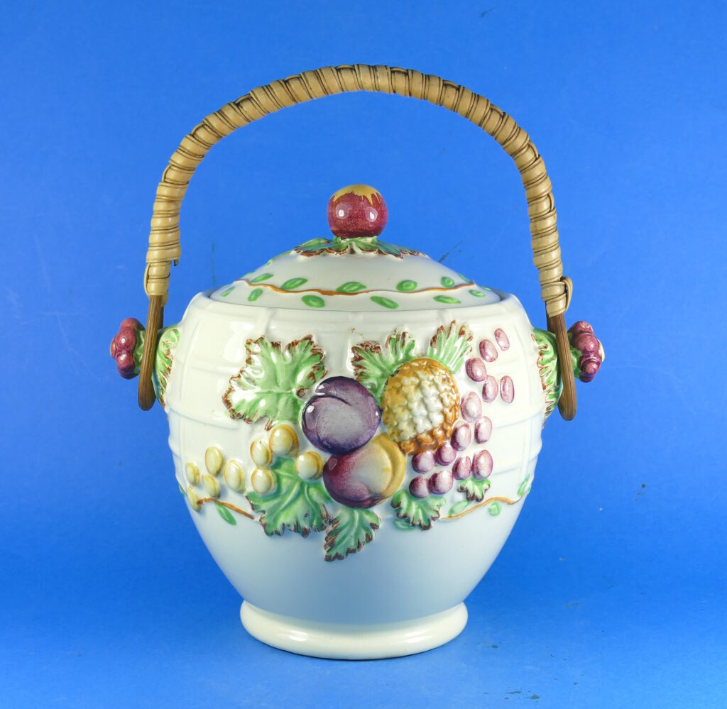 It has a basket of fruit and leaves design with bright coloured glazes over a honeyglaze colour.