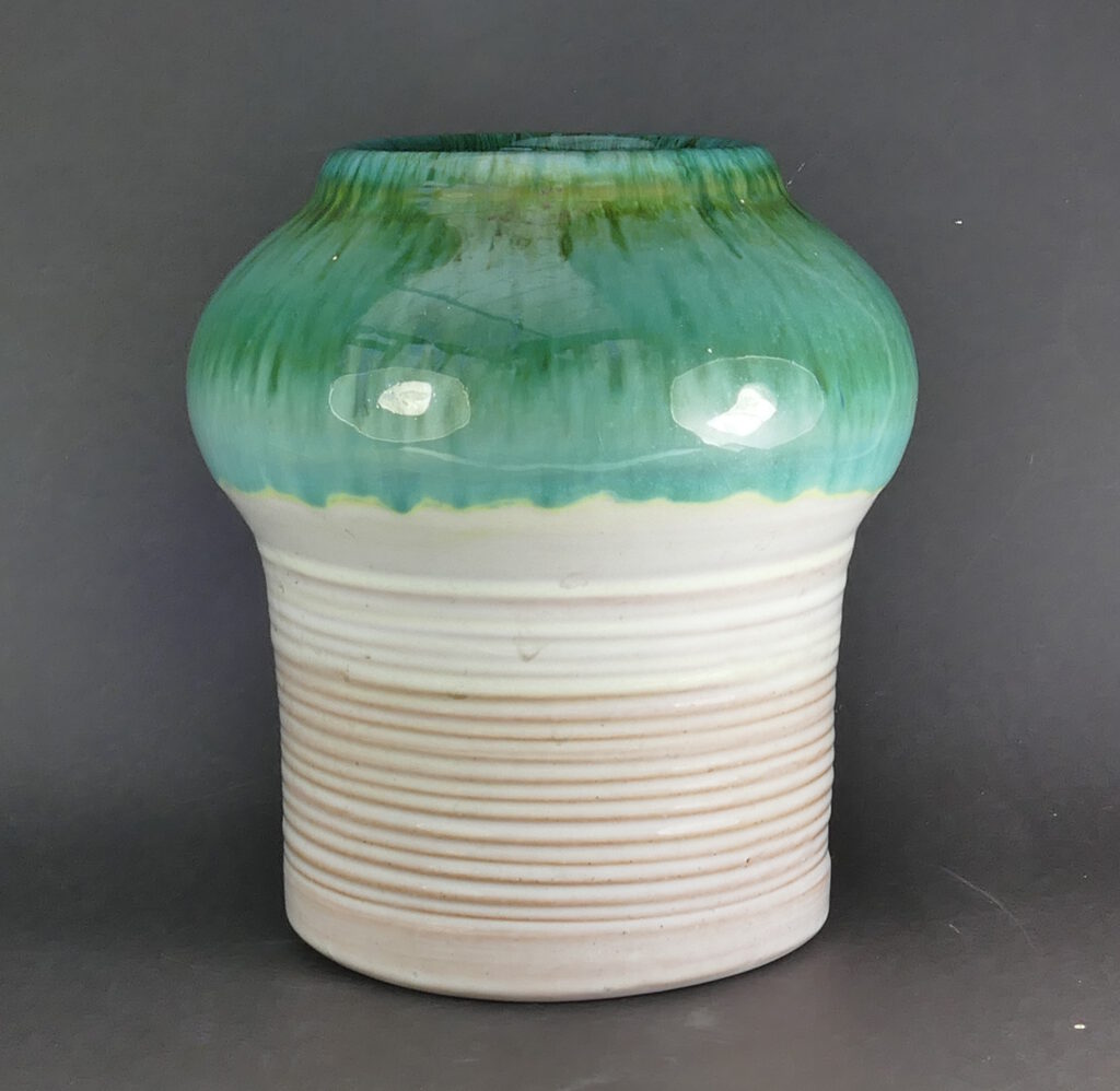 Hand thrown and decorated with glossy glazes. A delicate running green at the top and a creamy coloured lower parts. Incised makers mark on the underside.