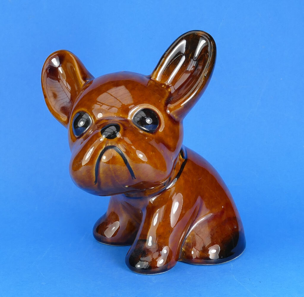 A charming novelty stoneware figure of a seated French Bulldog called Byngo.