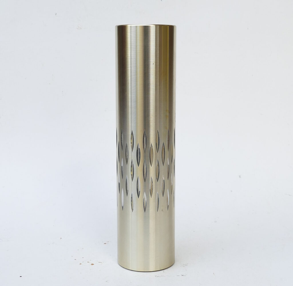 It has a tall cylinder shape with a textured surface and a cut pattern showing silver through the gold anodized surface.
